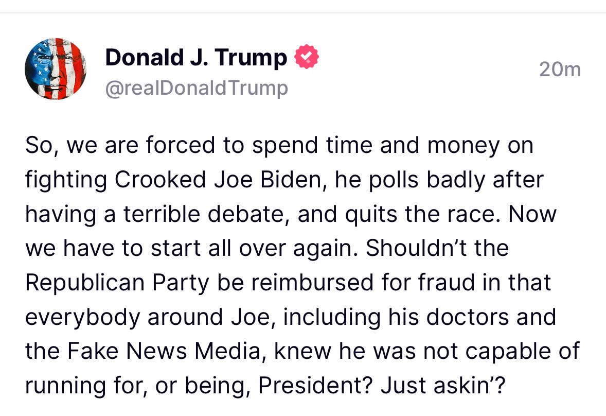 | ams288 Member since: Apr 21, 2016 Threads: 29 Posts: 13466 | As expected, Donny appears to be too afraid of debating Kamala, who would absolutely destroy him in any debate. “A straight man will not go for kids.” - AZDuffman |
