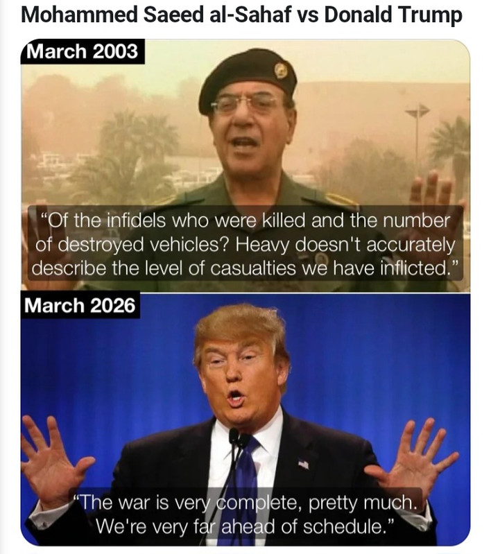 | terapined1 Member since: Nov 26, 2024 Threads: 2 Posts: 699 | ![]() Trump imitating Baghdad Bob |
