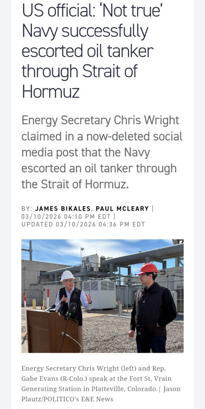 I don't think the WH knows what's going on They will say or post anything to get oil prices are down Once the lie comes to light , oil prices climb back up Energy secretary posted that the US escorted an oil tanker through the Strait Yea there is a lot of pressure on him to lower prices but to lie like Baghdad Bob is insanity The post was taken down and Karoline Leavitt had to confirm that US didn't escort jack POLITICO Pro | Article | US official: ‘Not true’ Navy successfully escorted oil tanker through Strait of Hormuz https://share.google/lAddAVvmm51agvfnv |
