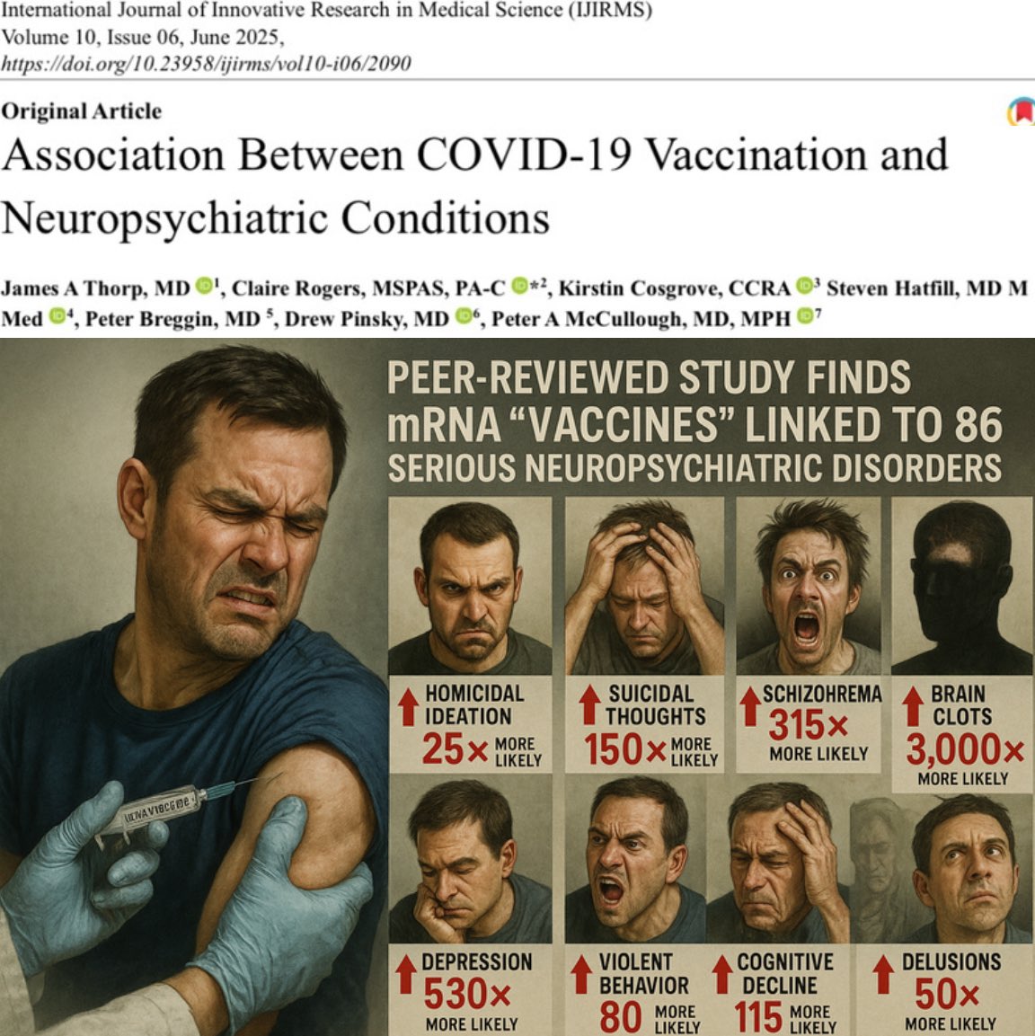 | DoubleGold Member since: Jan 26, 2023 Threads: 34 Posts: 4237 | Possible connection and explanation of the rise of fruitcakes [like yeast] and the Covid-19 vax: Here's a lower-hanging fruitcake but there are literally millions most every day with higher-hanging vaccinated fruit: ---------------- Mar 11, 2026 John David Tobias, who was previously charged with threatening Republican MN State Senator Glenn Gruenhagen, has been charged AGAIN for sending a threatening voicemail to Republican MN State Rep. Krista Knudsen. "I’m gonna come find all of you and kiII every one of you [censored] for treason." https://xcancel.com/libsoftiktok/status/2031869467190255880#m ---------------- Here's one paper connecting fruitcake comments to the Covid-19 vaccine: -------------- Association Between COVID-19 Vaccination and Neuropsychiatric Conditions Published: Jun 07, 2025 https://ijirms.in/index.php/ijirms/article/view/2090 ![]() ------------- It's possible one can predict to a high degree of accuracy which persons got the vax by their comments. In other words, extreme TDS could be caused by the Covid-19 vax. |
