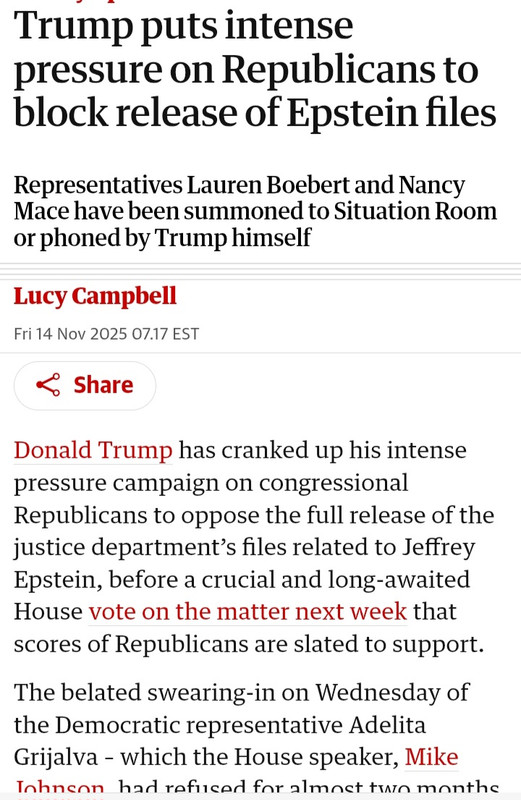 Notwithstanding that any files will be redacted to hell and back, what's opinions on how this will pan out? Will the house really vote to release 'everything'? Will the senate vote to release 'everything'? If both of the above, will 'everything' get released? If not, how not? Trump veto? Mother of all distractions? War in South America? I never believed that epstein would be trumps kryptonite, but it's certainly coinciding with some loss in his popularity. |