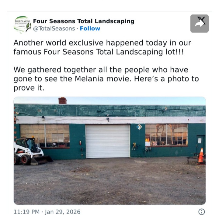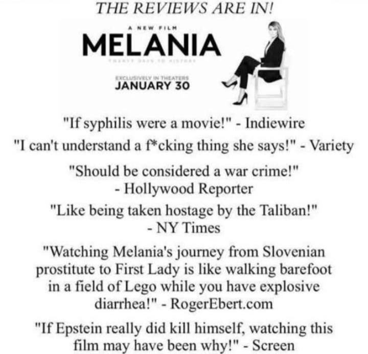 | rxwine Member since: Oct 24, 2012 Threads: 215 Posts: 22763 | The horror-thriller "Send Help,"oops. I mean Melania according to estimates shared Sunday, Feb. 8, by Amazon MGM Studios had a decline of 67% from the movie's first weekend, bringing its domestic total to date to $13.35 million. A 67% decline is considered a fairly large drop at the box office, generally indicating that devoted fans prioritized seeing the film early on and that there may not be a huge audience beyond that in theaters. "Trumpsplain (def.) explaining absolute nonsense said by TRUMP. |