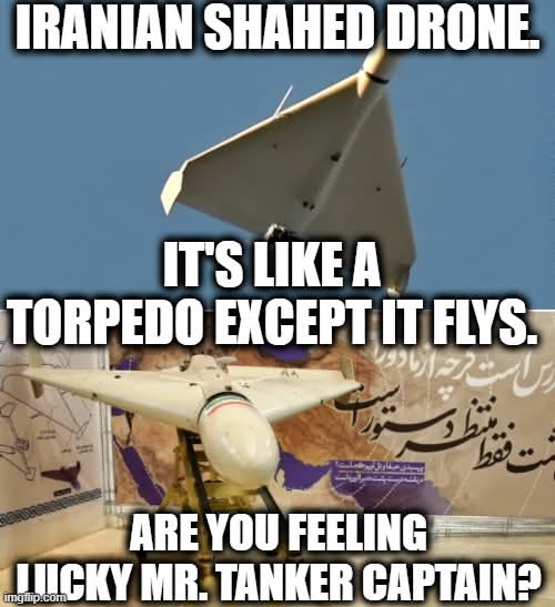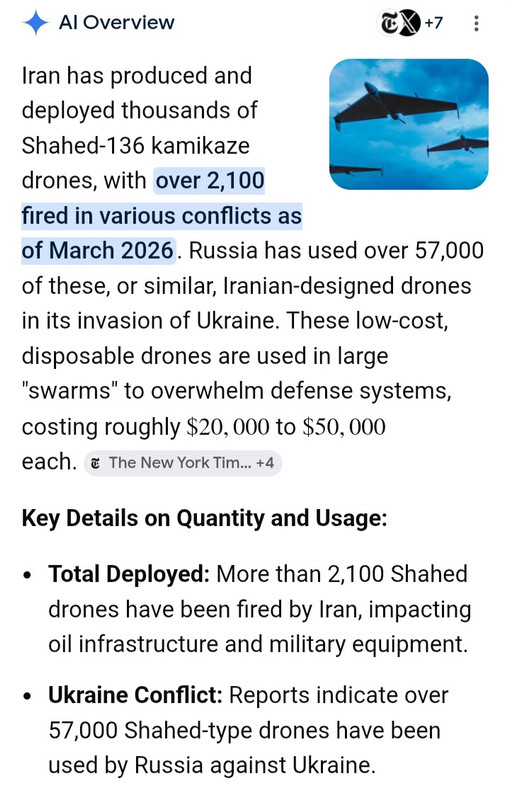 | terapined1 Member since: Nov 26, 2024 Threads: 2 Posts: 700 | This is Iran's main weapon They have fired thousands of these More coming as they manufacture this weapon It's relatively effective and pretty cheap to produce A lot cheaper then the expensive weapons we are using What's fascinating This is one of Russia's main weapons in the war with Ukraine ![]() ![]() Unless TACO Trump chickens out, this will be a long war No way we can win with just bombing We bombed North Vietnam to kingdom come and how did that work out Like Iraq, to win you need lots of boots on the ground I predict Trump finally chickens out It's the only way to lower gas prices and Iran knows it Iran pretty much has Trump by the balls if they can keep the Strait closed They have the weapons to keep the Strait closed and they know keeping it closed is their strongest weapon against Trump |