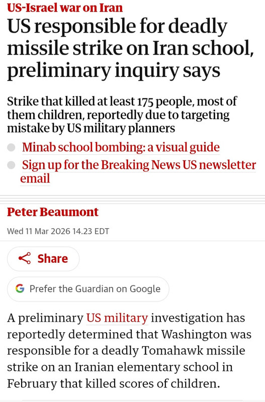 | terapined1 Member since: Nov 26, 2024 Threads: 2 Posts: 700 | https://www.theguardian.com/world/2026/mar/11/iran-war-missile-strike-elementary-school ![]() We got a forever war on our hands People don't forgive killing almost 175 children Hegseth allowed this too happen |