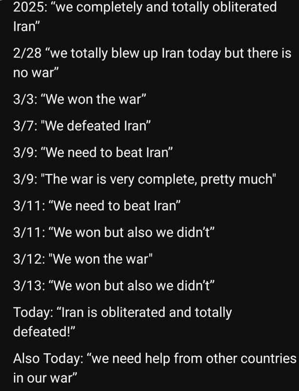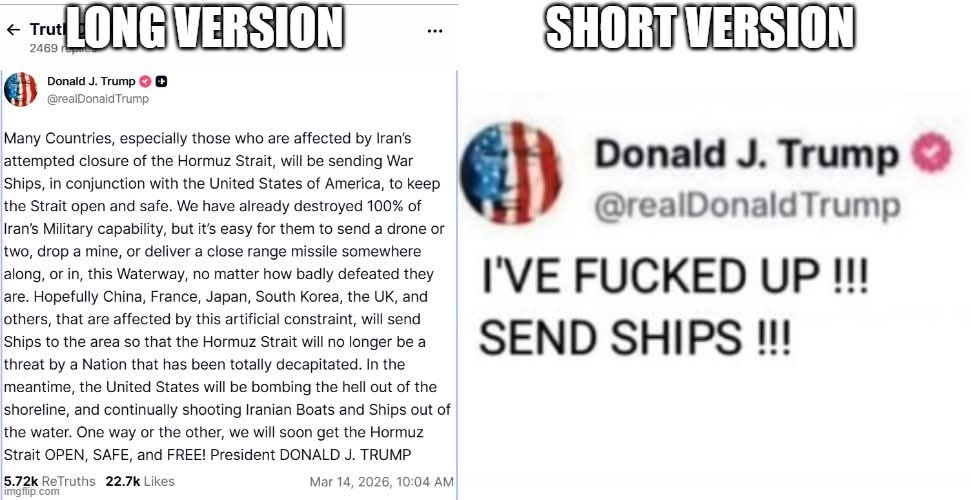 | OnceDear Member since: Nov 21, 2017 Threads: 15 Posts: 1788 | This is a (lame) effort to build himself an off-ramp: Say " I did all the prep and heavy lifting in this war and now those cissies in Europe can't be bothered to tidy up their own mess* so I said fuck them I'm bringing my boys home." Just a few minor problems: A closed Hormuz will continue to drive up US prices. US bases, embassies and business interests will carry on getting shelled. Russia and China will increase their influence in the region. US voters will ask "What did we gain from this expensive excursion?" Every venture he starts turns into a right effing mess for someone else to clean up. East wing, anyone? |