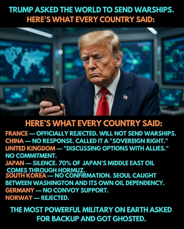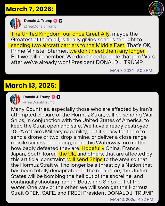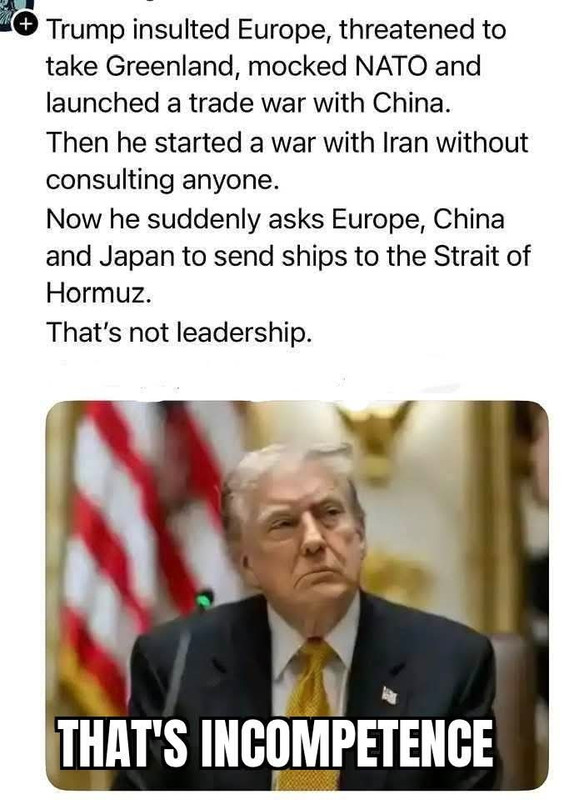 Art of the flail about, looking for an off ramp , Or looking for a patsy. He'll do to NATO and Europe what he'll do regardless of how we help or don't help in his war. So it would be dumb for any other nation to help the US. Helping our own interest in the region: Sure. Trump doesn't want to sit in the dock alone. Want's to fog the issue, share the blame. He never wanted to share any credit. |
