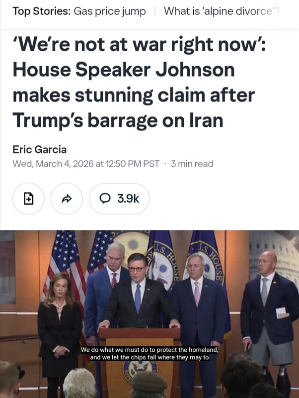 | Gandler Member since: Aug 15, 2019 Threads: 30 Posts: 5160 | Trump is saying we had to attack Iran because they were about to attack the U.S. and we were the ones who convinced Israel to attack. Does he even believe this? https://www.reuters.com/world/europe/trump-says-us-has-knocked-out-many-iranian-naval-air-targets-2026-03-03/ |