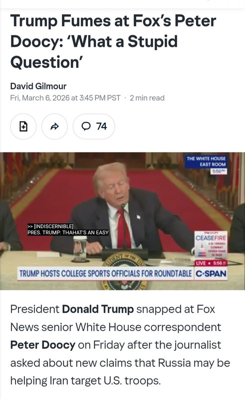 | missedhervee Member since: Apr 23, 2021 Threads: 158 Posts: 5469 | I see that Vlad "the Trump-nailer" Putin is sharing intelligence about the location of US forces with Iran. https://www.msn.com/en-us/news/world/russia-secretly-sharing-location-of-us-targets-with-iran-us-officials-say/ar-AA1XGq3O?ocid=hpmsn&cvid=69aba6e3b8f441d1a1c69595354e816e&ei=15 |