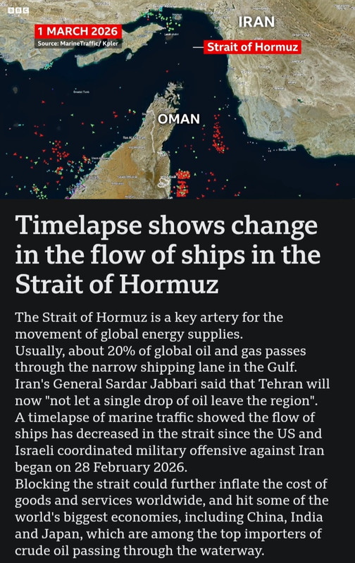 | terapined1 Member since: Nov 26, 2024 Threads: 2 Posts: 700 | Fascinating time lapse video We are so screwed Obviously this administration didn't forsee the consequences of attacking Iran Timelapse shows change in the flow of ships in the Strait of Hormuz https://share.google/q1KsHUGzcLkUhF7B7 |