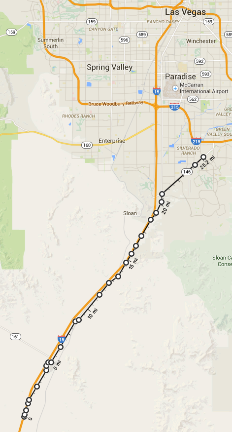 Here is a map of the route. ![]() Where the route turns about 45 degrees to the right towards the top is the M casino. Here is the plan: 1. Start at the M casino. 2. Head south on Las Vegas Blvd., which at that point is pretty much a frontage road to I-15. There should be little traffic and no lights or stop signs. 3. About 16 miles down we'll get to the "town" of Jean, which is just the Gold Strike casino, gas station, and vacant prison. 4. Keep going another 5 miles until the paved part of Las Vegas Blvd. ends and turn around. 5. Retrace route back to the M. 6. Make the 45-degree turn and head up the St. Rose Parkway bike trail to Eastern Avenue about 4 miles. 7. Turn around and head back to the M. If you wish, you can skip the part from Jean to the end of LV Blvd as well as the final stretch on the bike path. This will lower your miles to about 32. You will have to wait for me a little over an hour in Jean, but there is a pretty big casino there where I'm sure you can kill time. I might have a quick lunch there on the way back too. When we get back to the M you can decide if you can push on the last 8 miles or wish to wait for me.